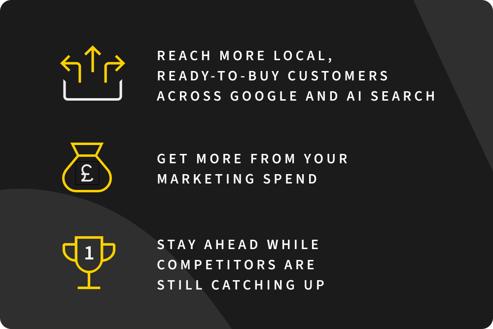 By keeping your website clear and structured, your details consistent across the web, and your reviews strong. Yell builds this into your solution so you’re ready for AI and traditional search.