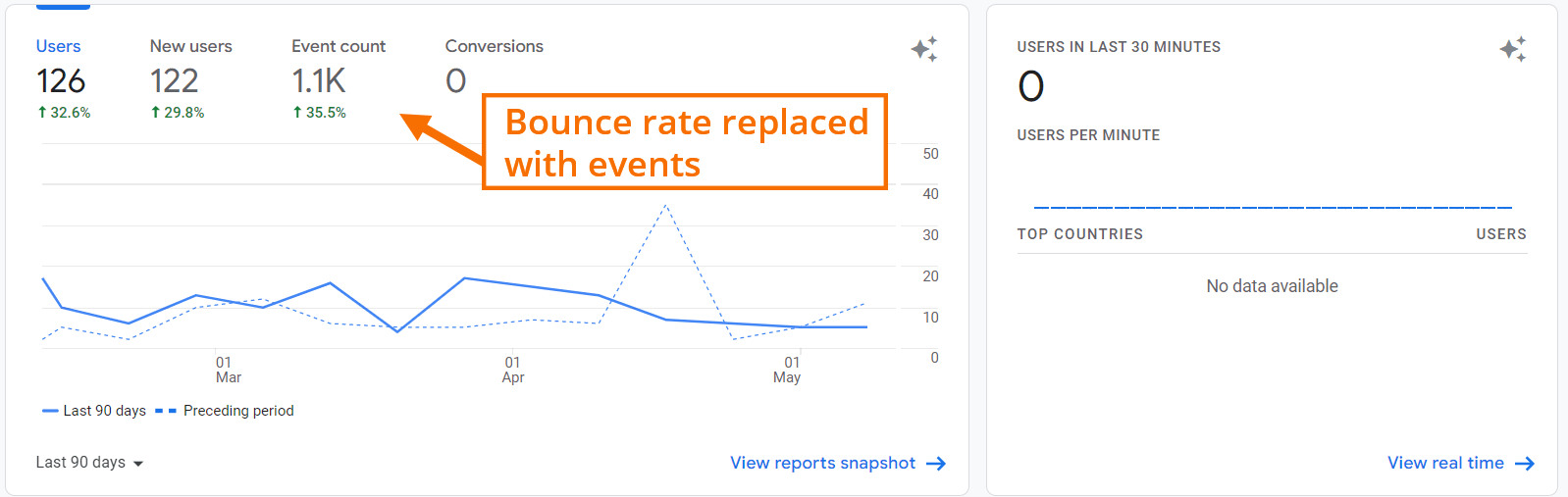 Instead of showing you the percentage of viewers who left your website after only visiting one page, Google has switched it around to show you the number of visitors engaging with your site. An ‘engaged session’ is one that meets one of the following requirements: